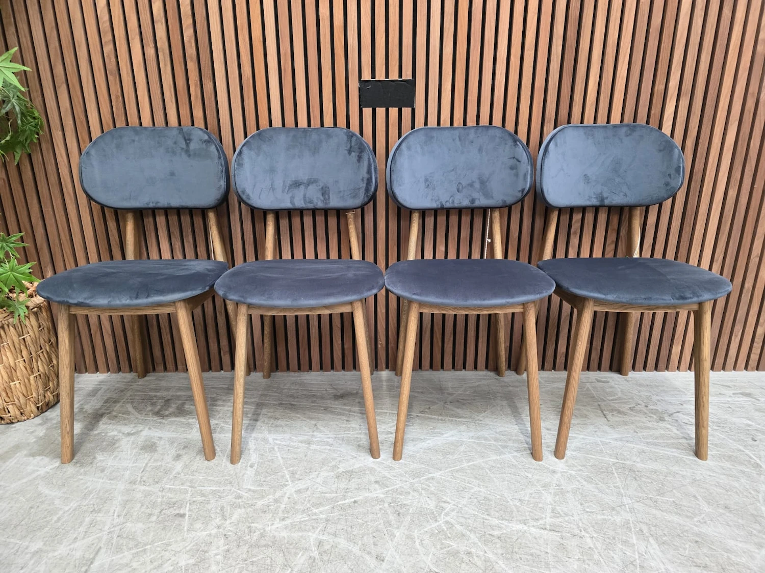 4x Tambour Mid-Century Modern Grey Oak & Velvet Dining Chairs RRP-£792