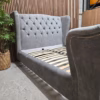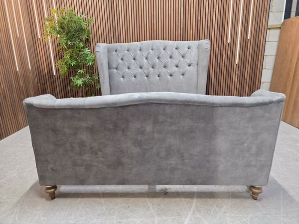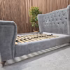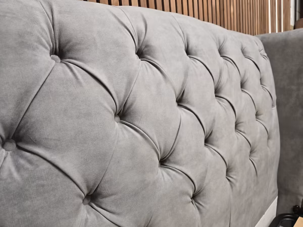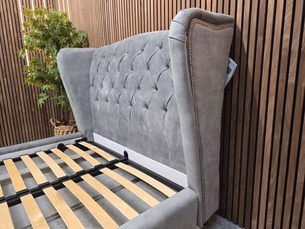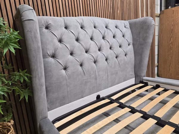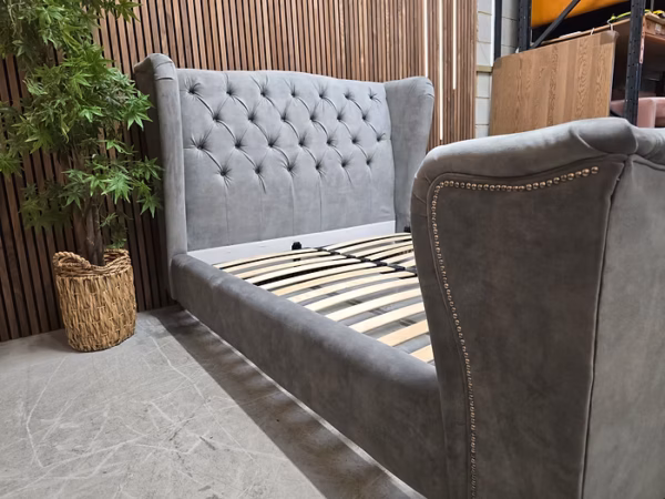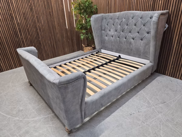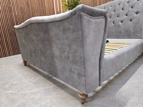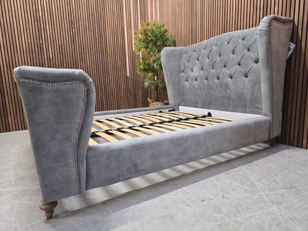 This Frame Features an Elegant Winged Headboard & Footboard Which Both Feature Studded Detailing to Add to The Feeling of Luxury. This Piece Features Signature Hand-Buttoned Accents & Sits on Carved Wooden Legs.