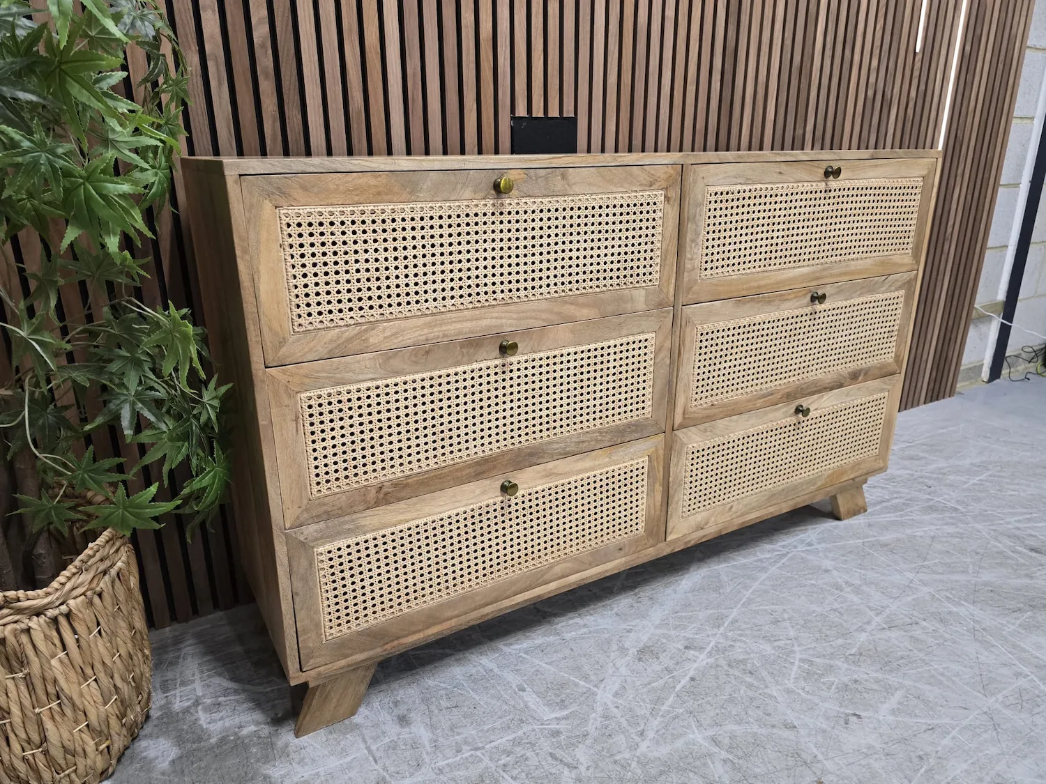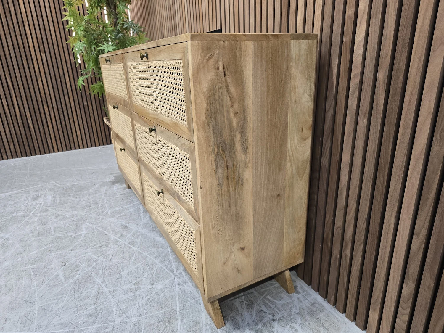 Boho Rustic Mango Wood & Rattan Large 6 Drawer Chest Of Drawers