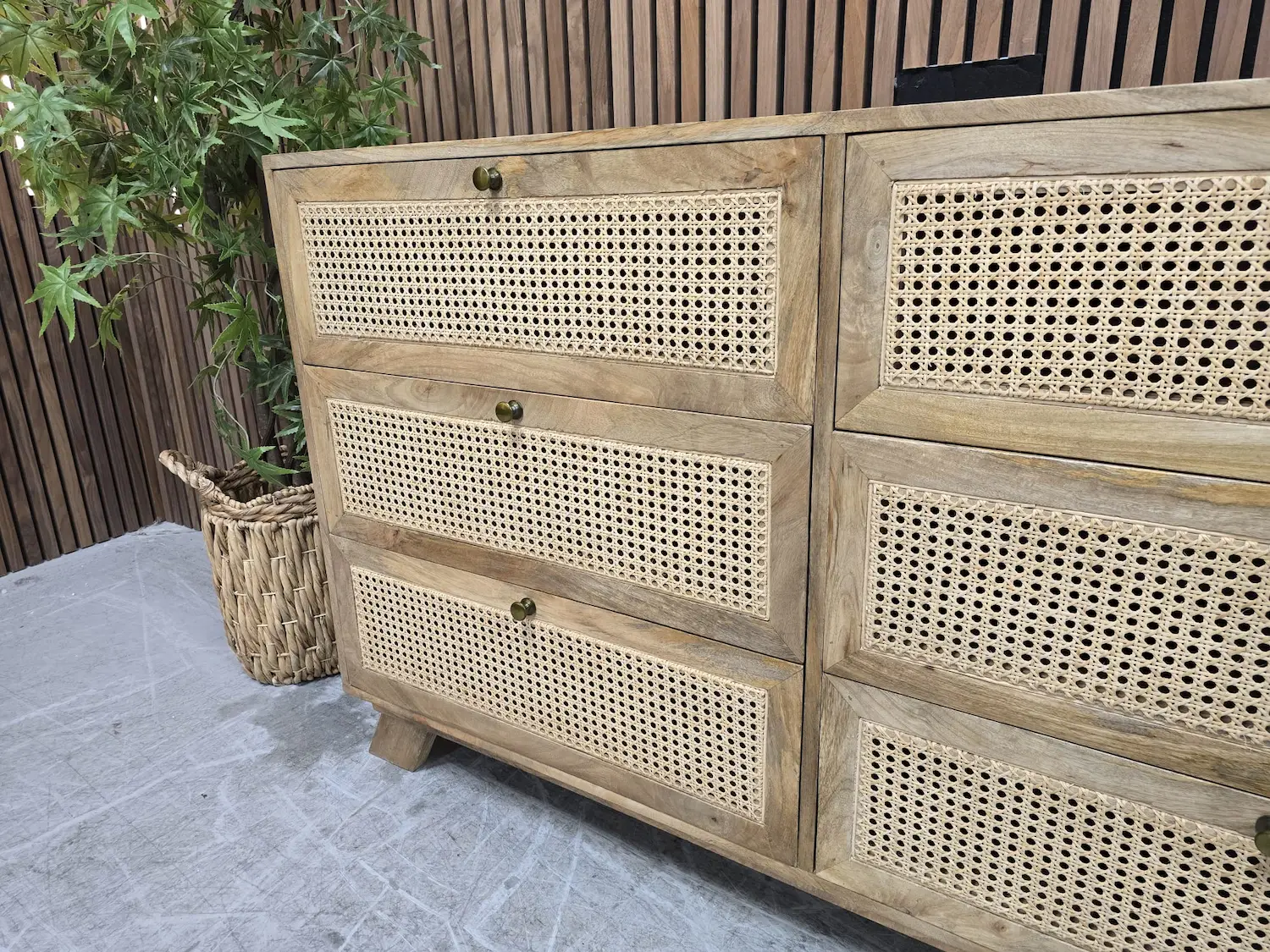 This Boho Rustic Solid Light Mango Wood & Rattan Six Drawer Wide Chest Will Add a Relaxed & Earthy Finish To The Room.