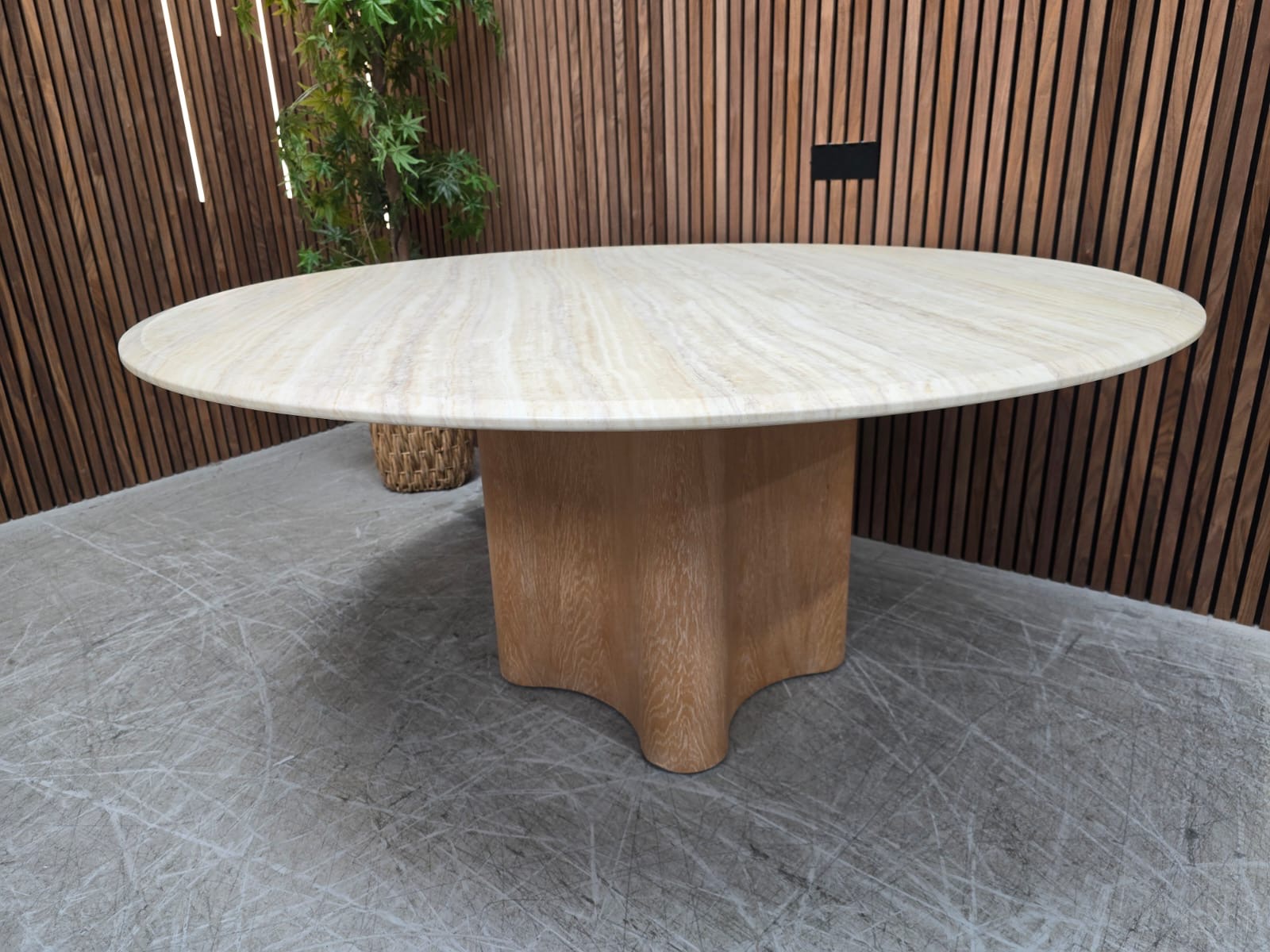The Traver Collection Showcases The Perfect Fusion Of Natural Elements And Post-Modern Design. Featuring A Fluid Wave-Like, Sculpted Pedestal Base, Evoking Sculptural Tree Trunks; And A Travertine “Wrapped” Top, Boasting Opulence, With Its Smooth, Matte Surface.