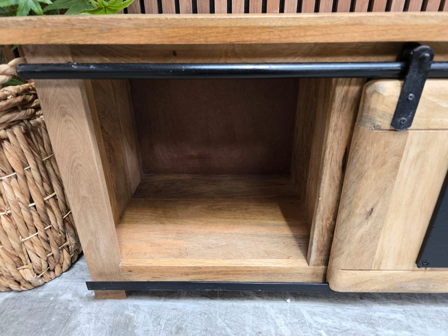 Industrial Rustic Solid Light Mango Wood & Black Metal TV Stand That Delivers Rugged Charm. This Stylish Cabinet Is Constructed From Solid Mango Wood, Delivering a Resilient & Sturdy Structure.