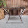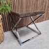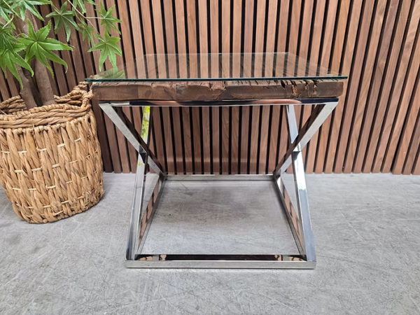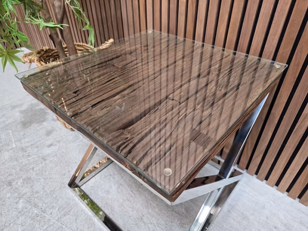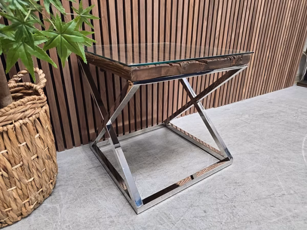 Perfectly Proportioned, This Chic Glass-Topped Side Table Is Made From Genuine Reclaimed Indian Railway Sleepers, Wonderfully Characterful. The Sturdy X-Shaped Base Is Polished Stainless Steel, a Fabulous Contrast to The Natural & Weathered Top. Altogether The Look Is Sleek & Stylish as Well as Warm & Casual, & The Perfect Way to Introduce The Modern Industrial Look to Your Living Room.