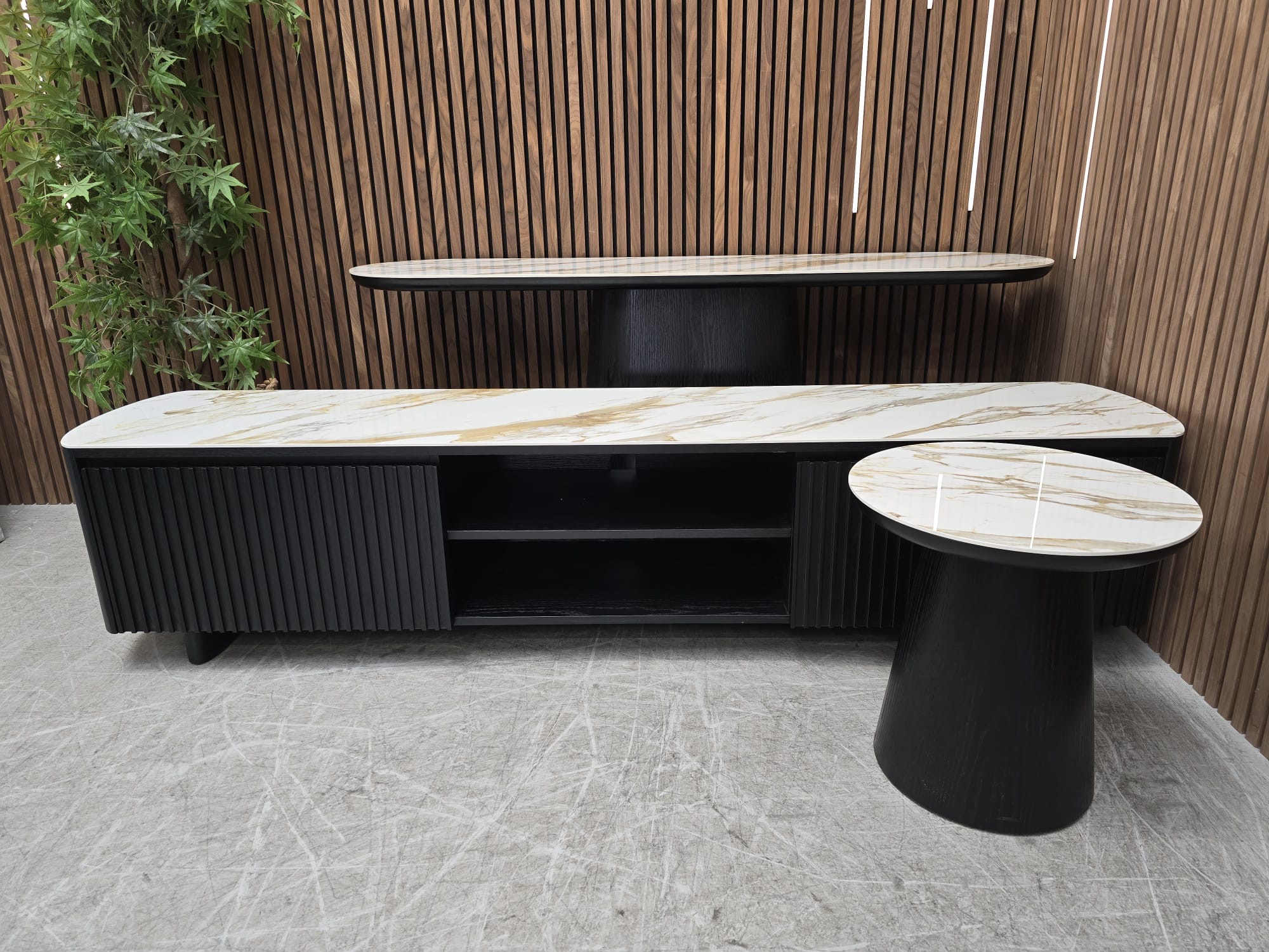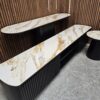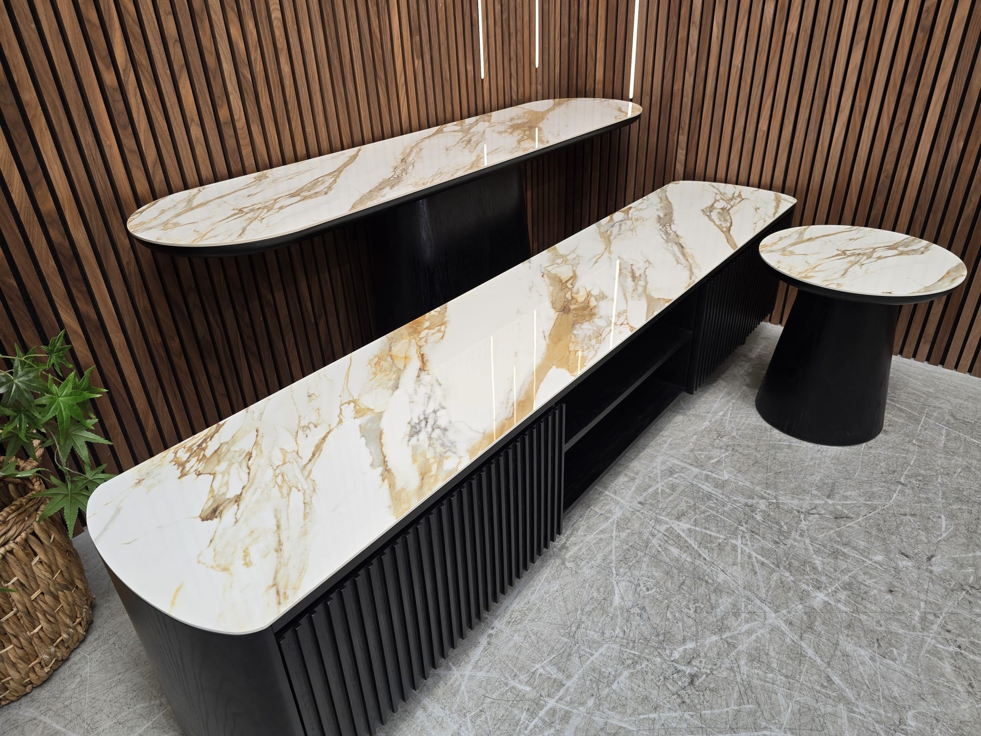 Elevate Your Living & Dining Spaces With The Glamorous & Contemporary Allegria Range. Showcasing Exquisite Craftsmanship With Smoked Oak Fluted Battens & a Ceramic Top; Allegria’s Curved Silhouette Offers An Elegantly Modern Look.