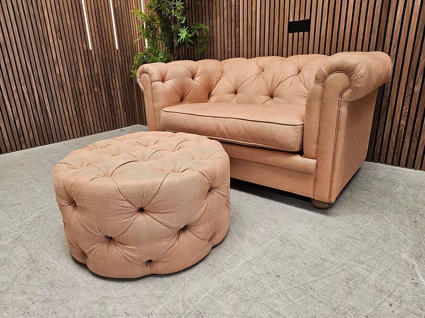 Sofa.com Patrick Chesterfield Loveseat & Footstool In Ian Mankin Herringbone Fabric
